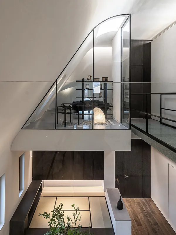 The third-floor studio and bedroom sit at opposite ends, joined by a suspended bridge that crosses above the garden. This layered composition heightens the sense of depth and continuity, while glass partitions blur the line between interior and exterior, turning the garden into a shared visual extension of every floor.