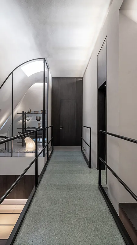 A unified material palette ensures spatial continuity: structural elements like the chimney, cantilevers, linked bridge, and staircases are clad in dark green terrazzo, forming a continuous structural spine that runs through the building. This matte mineral texture contrasts subtly with rough plaster walls, while the white plaster curved ceiling on the third floor becomes a canvas for diffused light. Material juxtapositions not only reinforce tectonic logic but also hint at the unique luminous qualities of each space.