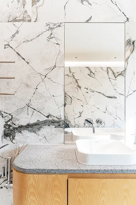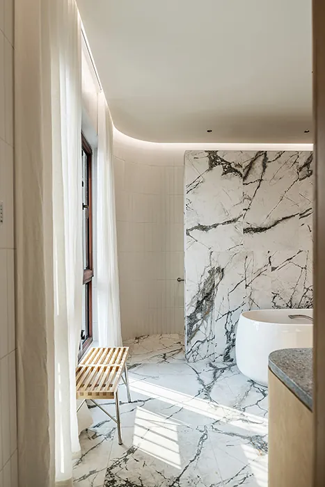 The master bathroom continues the home’s dialogue of light and material. Vertical tiles wrap the curved wall, their gentle rhythm brought to life by soft, concealed lighting.