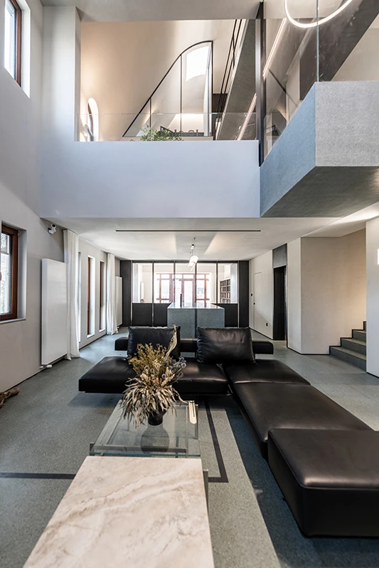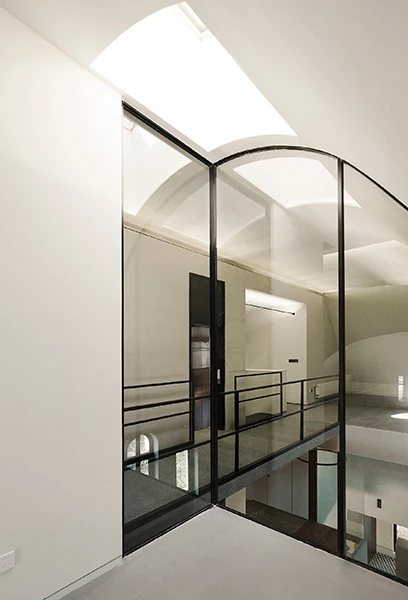 This matte mineral texture contrasts subtly with rough plaster walls, while the white plaster curved ceiling on the third floor becomes a canvas for diffused light.