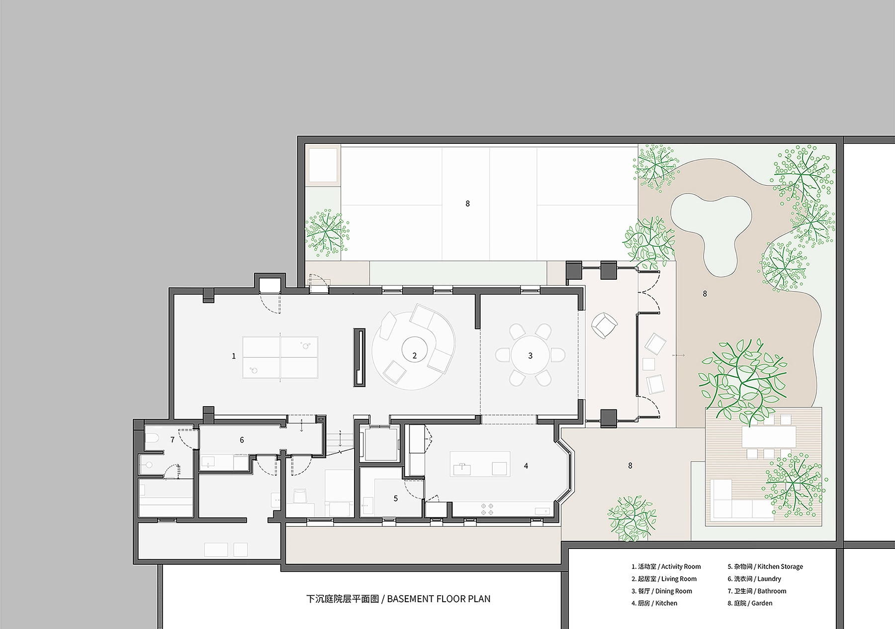 Highly frequented areas such as the dining area, kitchen, and master bedroom are positioned along the southern edge, engaging directly with a sunken courtyard
