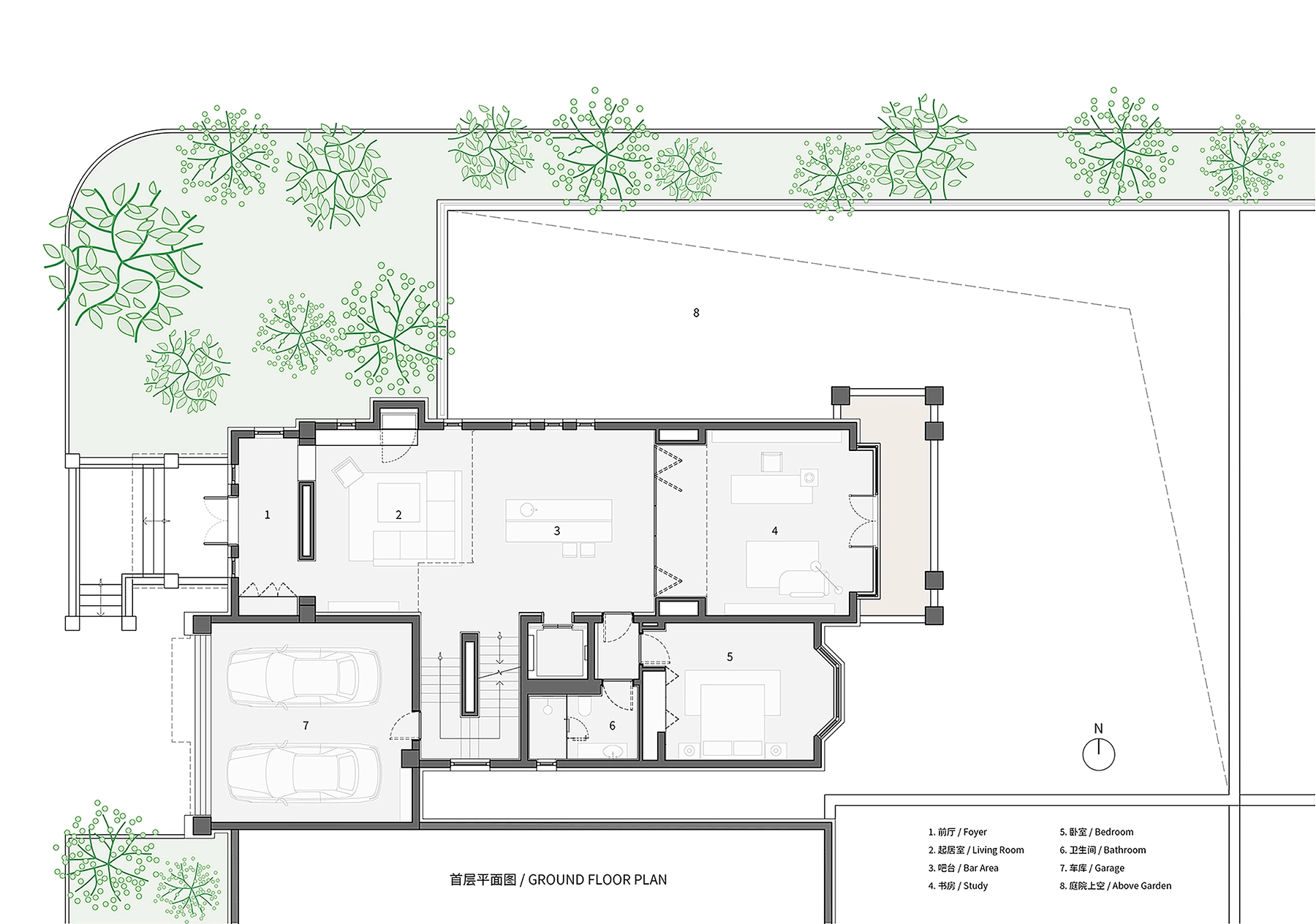 The double-height garden acts as the spatial heart of the house, with greenery forming a visual focus that links living, working, and resting areas. Together with the cantilevered glass box and the connecting bridge, it creates a dynamic sequence of spaces where views shift gradually as one moves through the house.